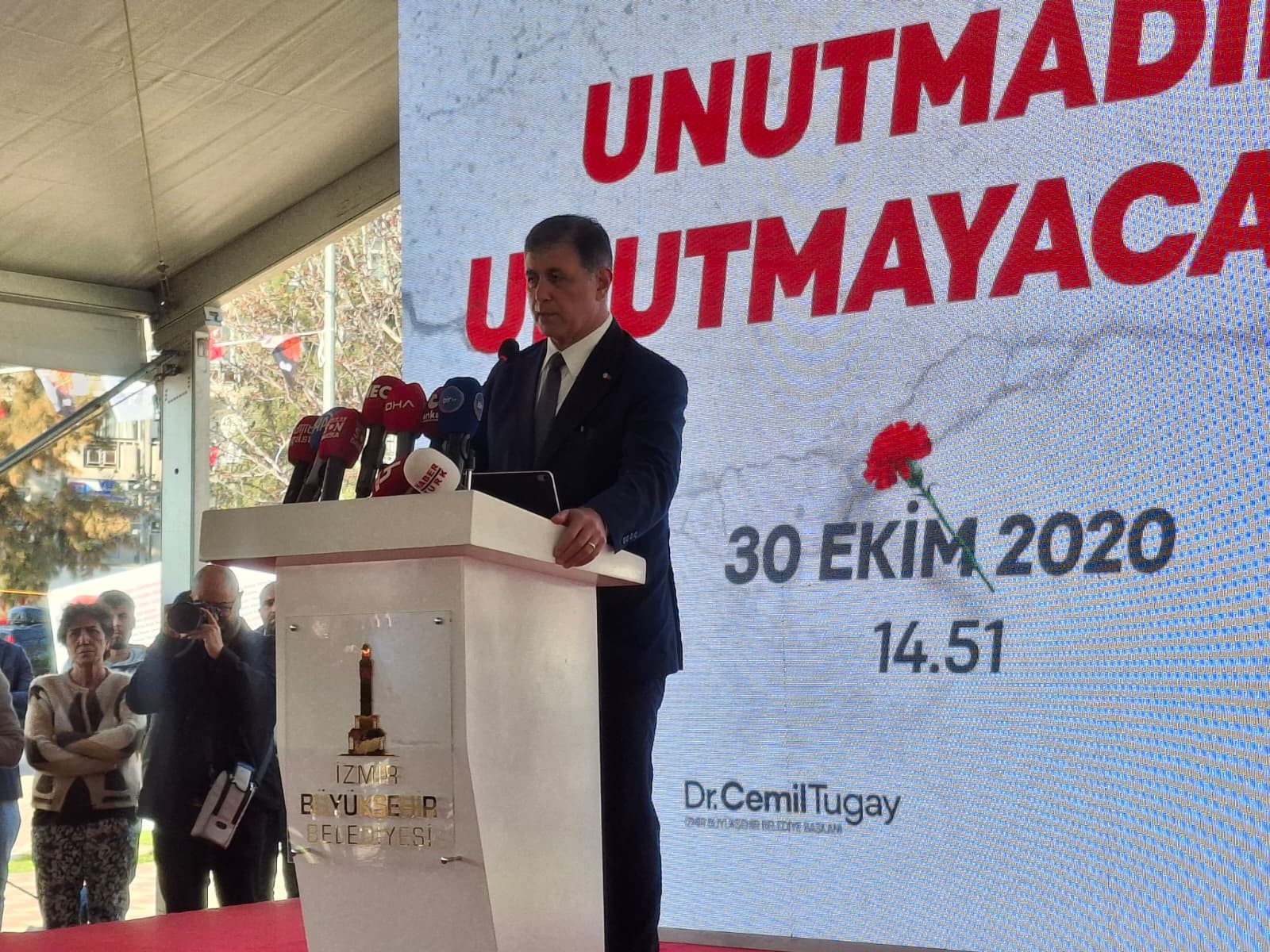 EGE POSTASI- 30 Ekim 2020 tarihinde İzmir’de meydana gelen 6.6 büyüklüğünde gerçekleşen deprem nedeniyle Bayraklı Deprem Anıtı’nda İzmir Büyükşehir Belediyesi tarafından tören gerçekleştirildi.
