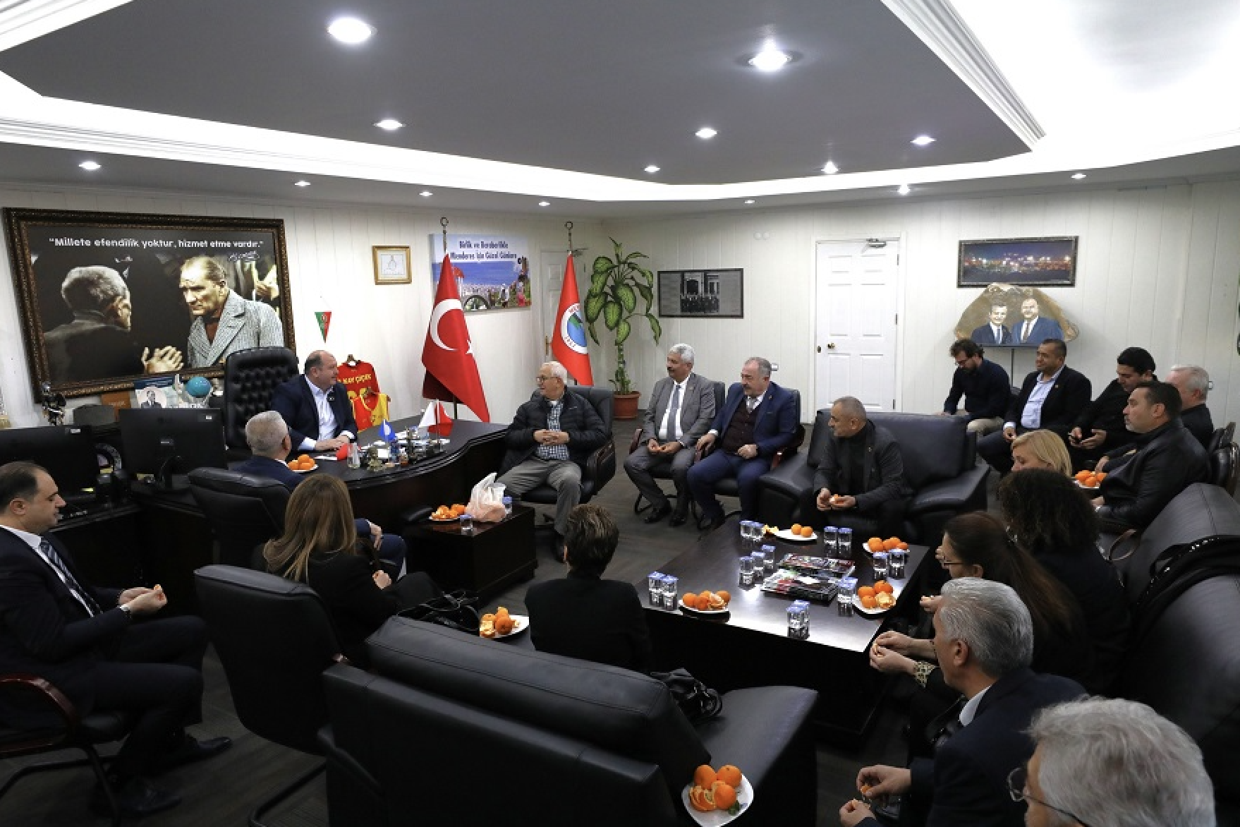 Ülkenin çeşitli bölgelerinden çalıştay için Menderes’e gelen muhtarlar, muhtarlıktan Belediye Başkanlığı’na gelen Menderes Belediye Başkanı İlkay Çiçek’i de makamında ziyaret etti. İzmir Muhtarlar Federasyonu Başkanı Sedat Erşahin ile birlikte gerçekleşen ziyarette muhtarlar Başkan Çiçek’e verdiği katkılar için teşekkür ettiler.