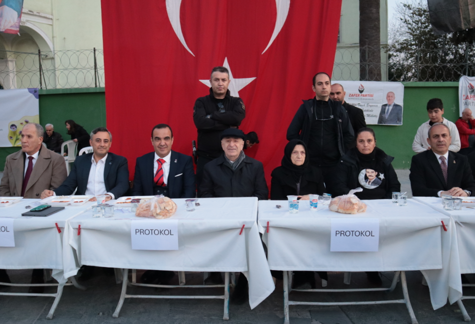 Zafer Partisi İl Başkanı Sinan Bezircioğlu, “Zafer Partisi Genel Başkanı Ümit Özdağ, Zafer Partisi Divan Kurulu üyelerimiz, Genel İdare Kurulu üyelerimiz, il başkanlarımız, ilçe başkanlarımız, teşkilatımızın kıymetli mensupları, şehidimiz Sinan Ateş'in kıymetli annesi ve ablası… Ve bu güzel geceyi bizlerle paylaşan, bizleri yalnız bırakmayan kıymetli hemşehrilerimiz İzmirliler, hoş geldiniz, şeref verdiniz. Bugün bu iftarda bizleri yalnız bırakmadınız. Bu mütevazı soframızda bizleri yalnız bırakmadınız. Bu sofra Zekeriya sofrası, bu sofra Halil İbrahim sofrası. Bu sofrada haram yok, bu sofrada kul hakkı yok. Bu sofra tertemiz Türklerin, Türk’ün sofrası. Bugün burada emeği geçen teşkilatımızın mensuplarına ayrı bir teşekkür etmek istiyorum. Ufak tefek aksaklıklar olduysa bizleri affedin. Hoş geldiniz, şeref verdiniz. İyi ki geldiniz. Bereketli olsun. Ramazanınız mübarek olsun. Yaklaşan bayramınız mübarek olsun. Türkiye'nin zaferi olsun” diye konuştu.