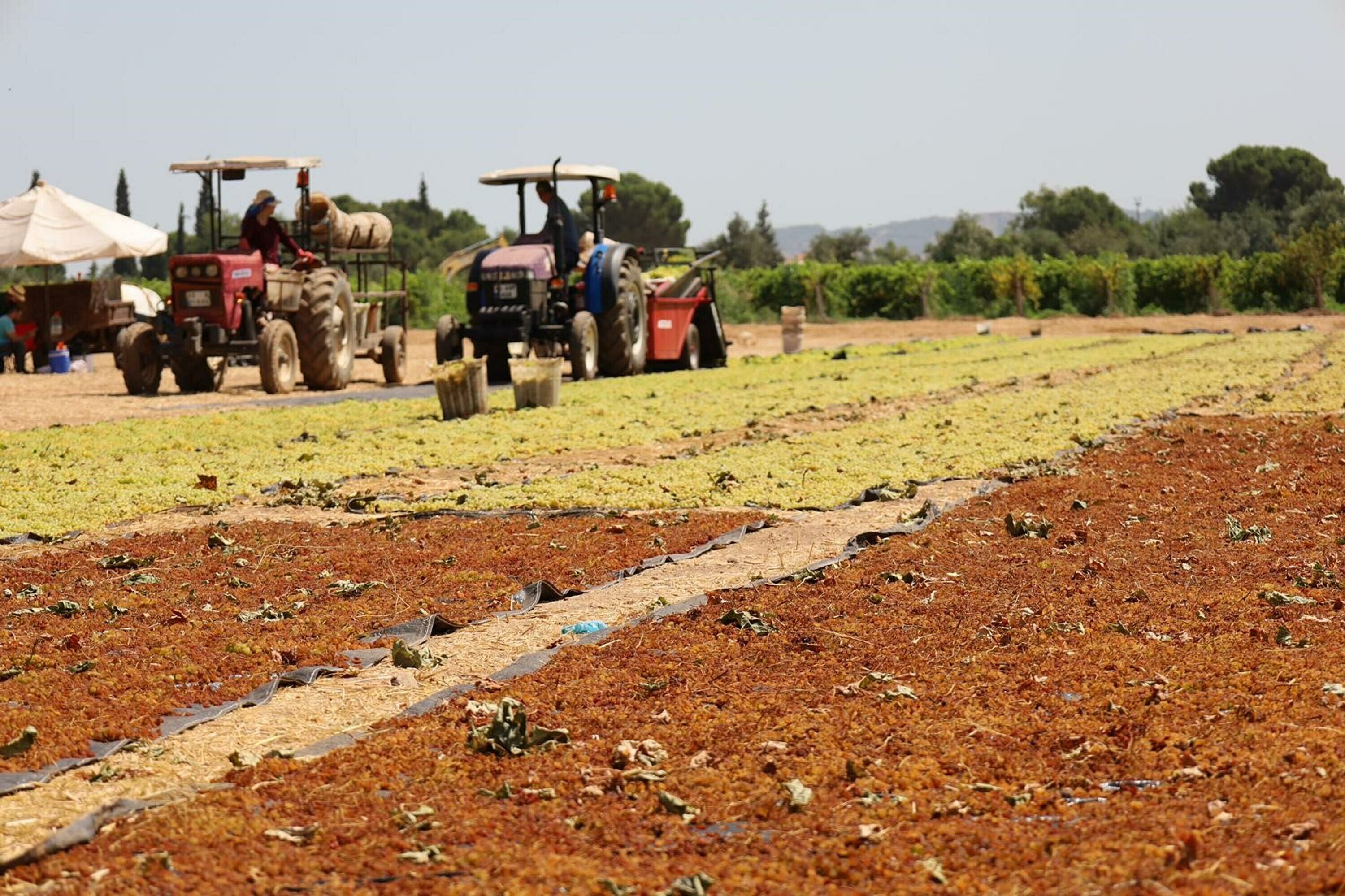 Turgutlu ilçesinde Sultani çekirdeksiz üzüm hasadı sürüyor. Ağustos ayında başlayan ve eylül sonuna kadar süren hasat döneminde üzümler, traktörlerle kurutma alanlarına taşınıyor.
