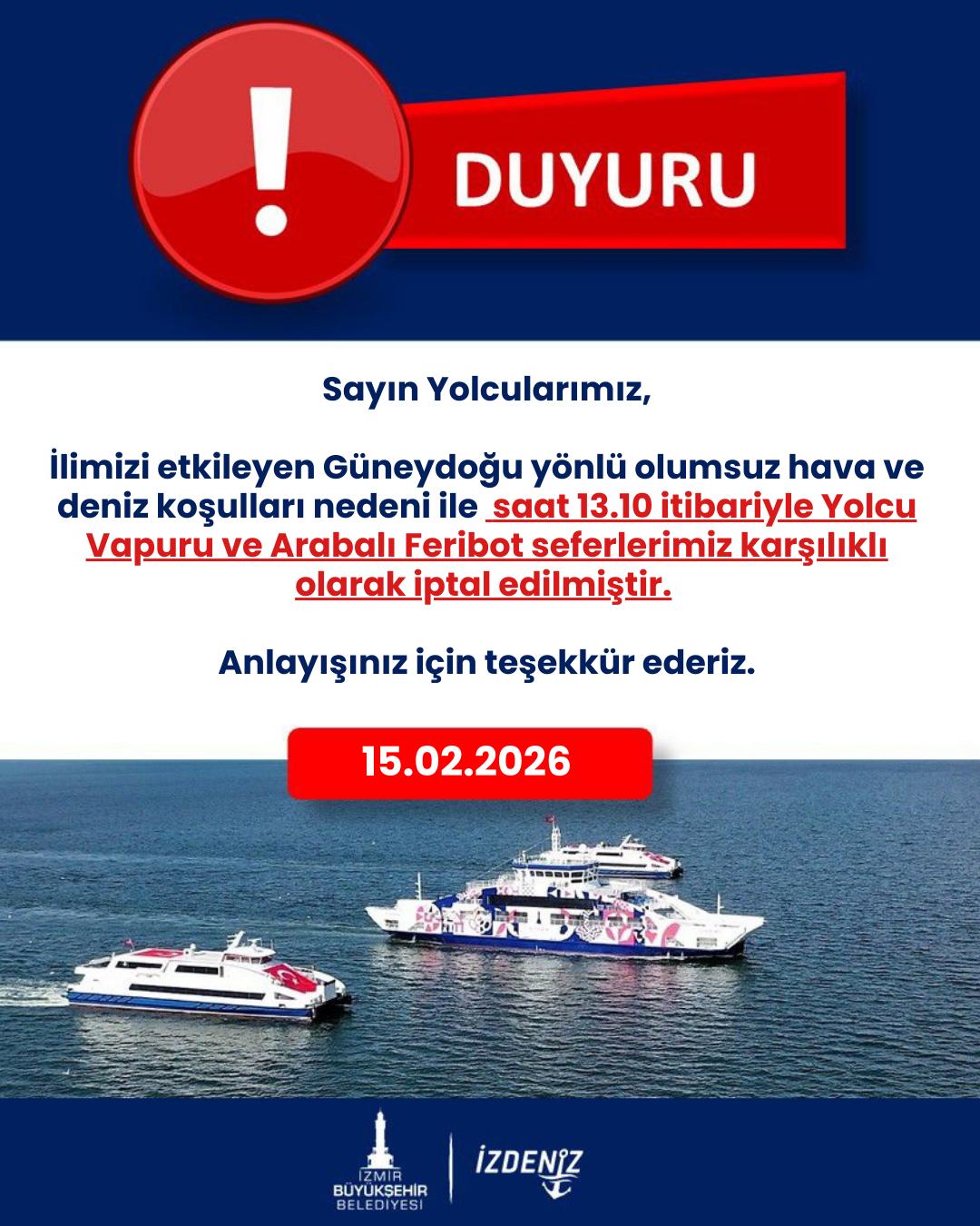 İZDENİZ, saat 13:10 itibarıyla yolcu vapuru ile arabalı feribot seferlerinin karşılıklı olarak iptal edildiğini duyurdu.