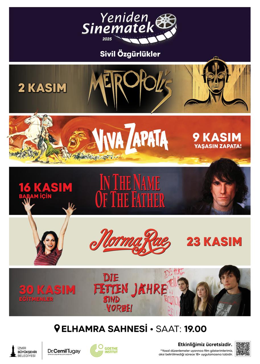 İzmirli sinemaseverler, İzmir Büyükşehir Belediyesi Yeniden Sinematek gösterimleriyle kasım ayında da buluşuyor. Elhamra Sahnesi’nde bu ay “Sivil Özgürlükler" seçkisi yer alacak. Seçki, toplumsal yapıdaki aksaklık ve farklılıklar, sınıf mücadelesi ve gücü elinde tutan sisteme karşı azınlığın direnişi gibi konuları içeren filmlerden oluşuyor. Filmler, ücretsiz olarak kasım ayı boyunca her pazar saat 19.00'da gösterilecek. Ayrıntılı bilgi için kultursanat.izmir.bel.tr adresi ziyaret edilebilir.
